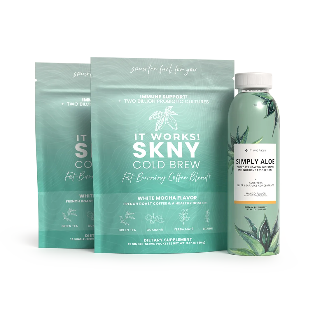 Sip your way to feeling energized and refreshed with this morning duo. Every serving of Skinny Cold Brew – White Mocha contains two billion probiotic cultures to help maintain healthy gut bacterial balance, plus plant-based caffeine to support your metabolism. Adding Simply Aloe – Mango to your morning routine will also help soothe your stomach and support overall gut health.